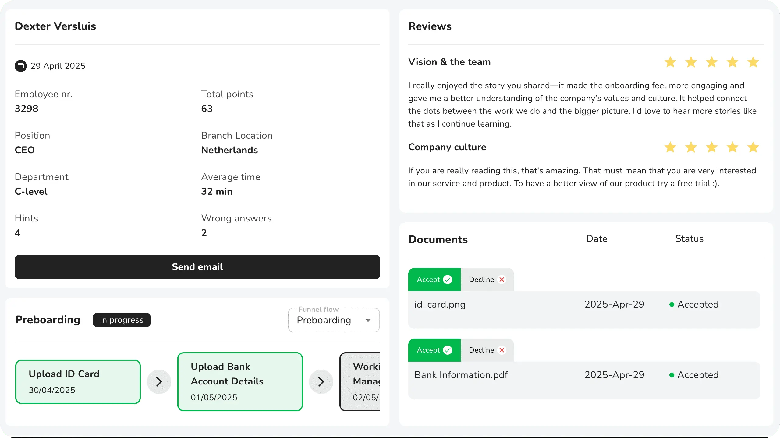 Let employees earn XP in a fun way for every activity they complete. Every action counts, but those who are late earn less XP. It motivates employees to stay engaged and compete for the highest level. Who will top the leaderboard?